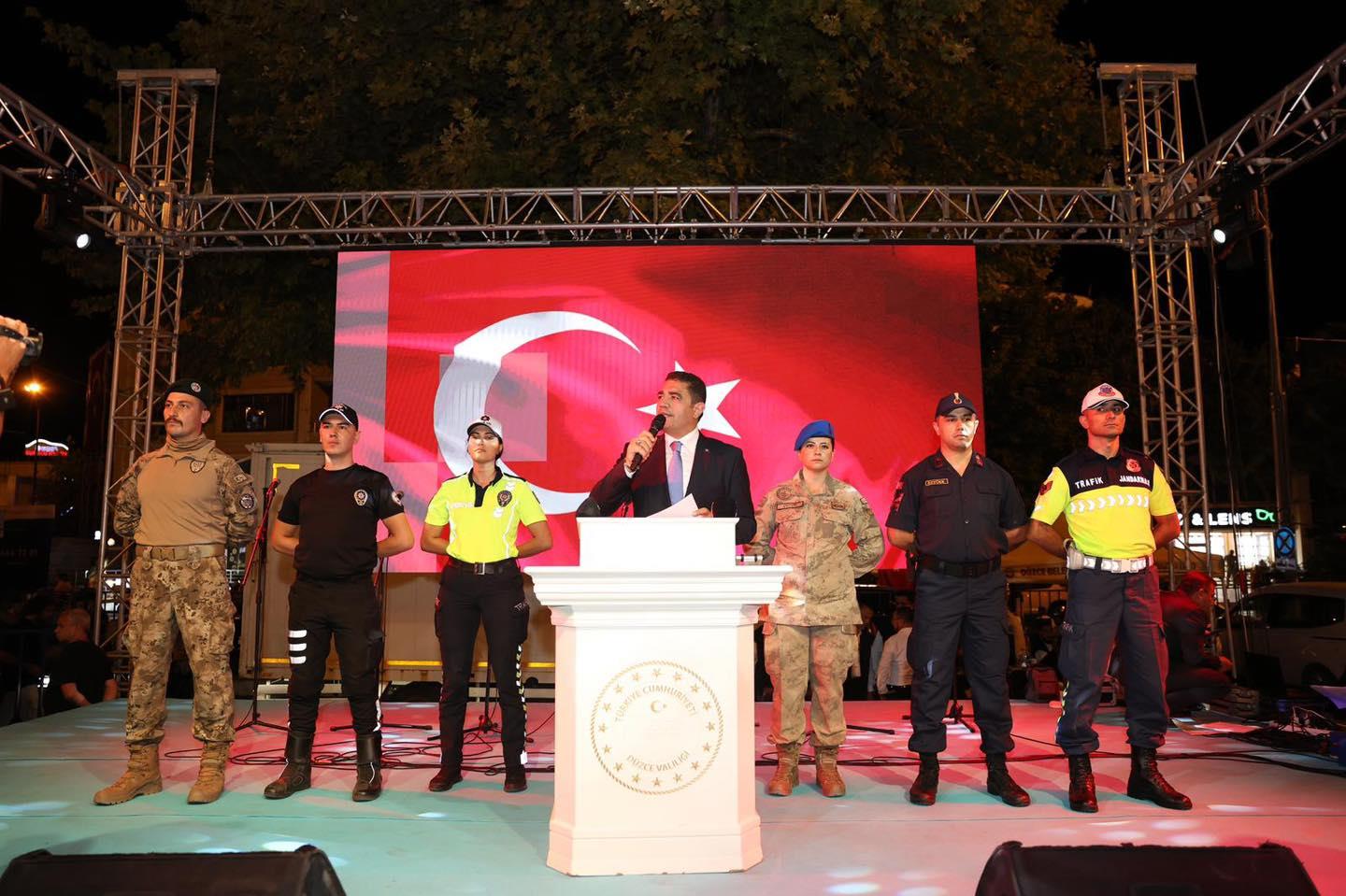 15 Temmuz Demokrasi ve Millî Birlik Günü programına, Valimiz Sayın Selçuk ASLAN ve eşi Sayın Pınar Aslan Hanımefendi, Düzce Belediye Başkanı Sayın Dr. Faruk ÖZLÜ, Düzce Milletvekili Sayın Ercan ÖZTÜRK, ilimiz protokolü, kamu kurum ve kuruluşlarının temsilcileri, şehit aileleri, gaziler, STK temsilcileri ve vatandaşlarımız katılım sağladı.