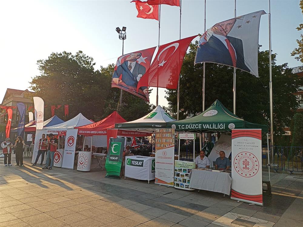"Zaferin Adı Türkiye" temasıyla gerçekleştirilen etkinlikler kapsamında, Anıtpark Meydanı’nda yerli ve milli üretim araç ve teçhizatlar sergilenerek vatandaşların ilgisine sunuldu. Kamu kurum kuruluşları ve sivil toplum kuruluşları tarafından stantlar kurularak faaliyet tanıtımları yapıldı ve etkinlik alanları oluşturuldu. Düzce İl Kültür ve Turizm Müdürlüğümüz tarafından, Anıtpark Meydanında etkinlik alanında kurulan tanıtım standında, İlimizin tarihi, kültürel ve turizm değerleri tanıtıldı. Müdürlüğümüze bağlı Düzce İl Halk Kütüphanesi tarafından 15 Temmuz’la ilgili yayınlar sergilendi.
