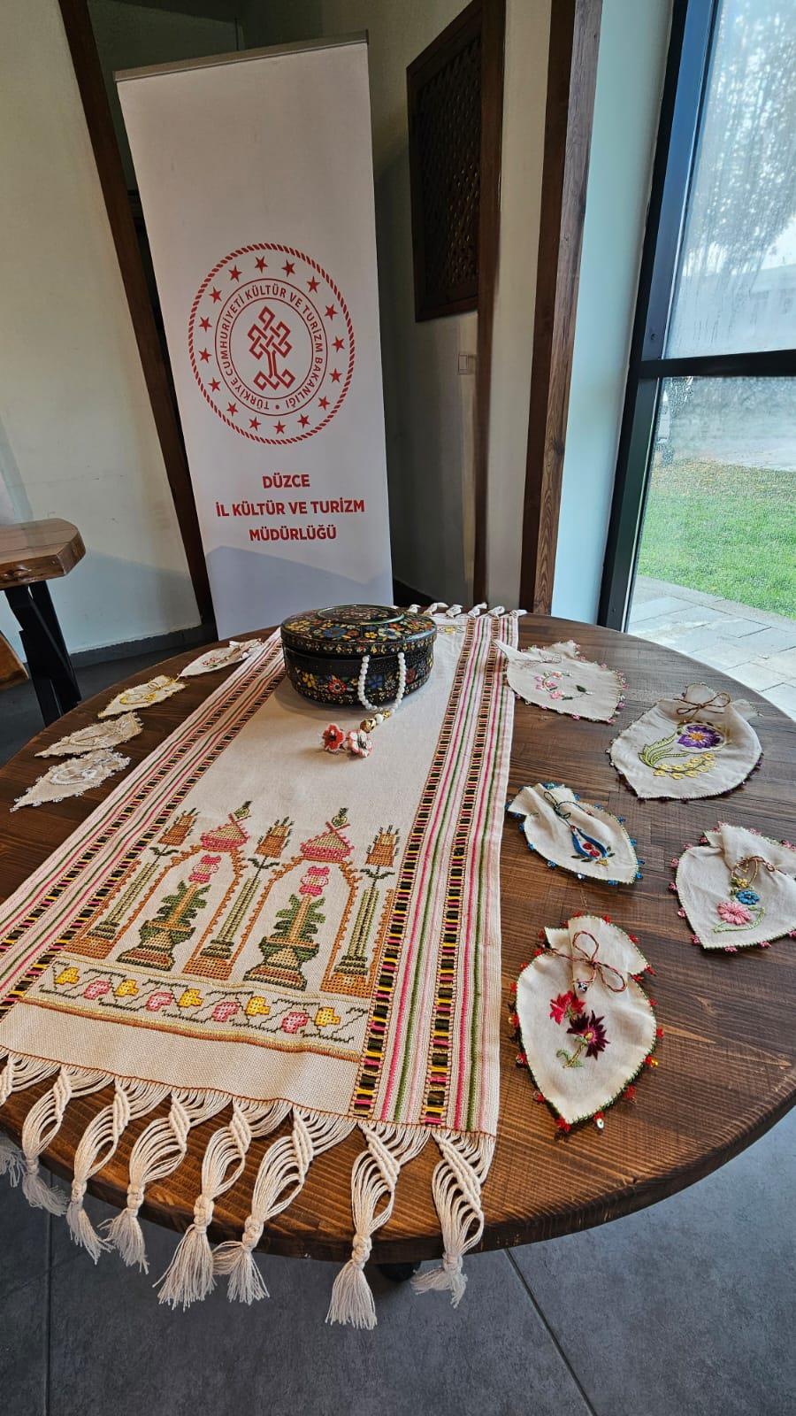 Bakanlığımız Yaşayan Miras ve Kültürel Etkinlikler Genel Müdürlüğü tarafından yürütülen “Türk Süsleme Sanatları ve Geleneksel El Sanatları Kursları Yönetmeliği” kapsamında, geleneksel sanatlarımızı yaşatmak ve gelecek nesillere aktarılmasını sağlamak amacıyla Somut Olmayan Kültürel Miras Taşıyıcısı Kartı sahibi Meral ÇARIKÇI KABA’nın eğitmenliğinde 28.04.2025-10.09.2025 tarihleri arasında gerçekleştirilen “El Nakışları Kursu”nda kursiyerler tarafından özenle hazırlanan eserler ziyaretçilerin beğenisine sunuldu.